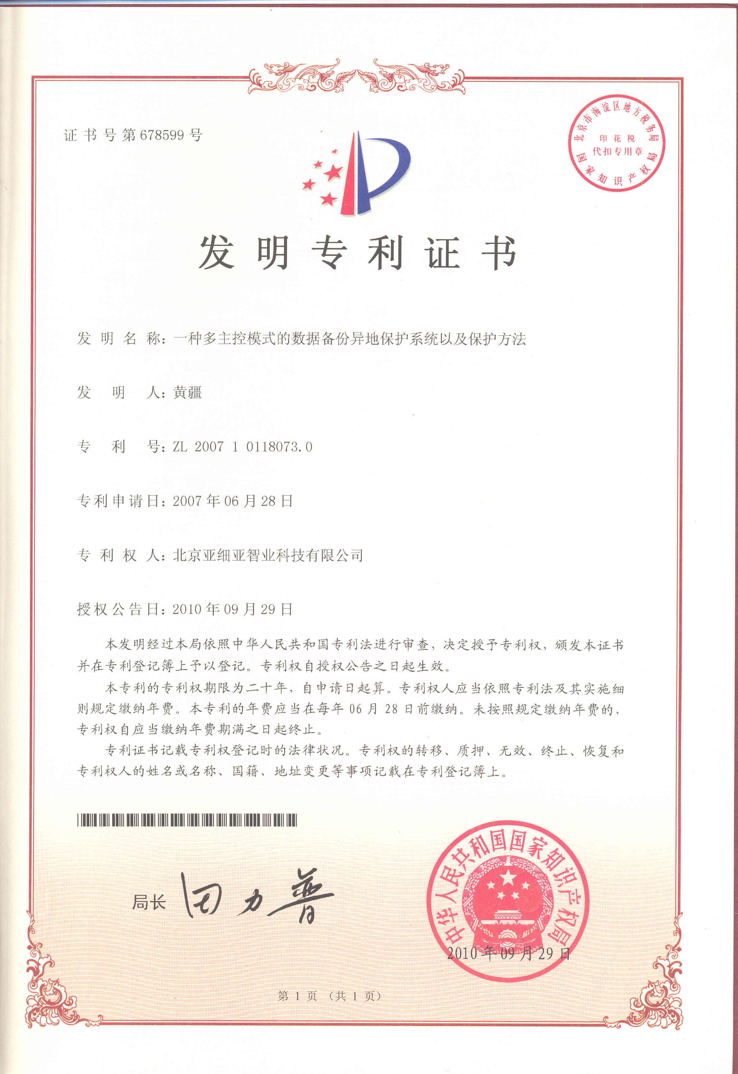 專利證書(一種多控模式的數(shù)據(jù)備份異地保護系統(tǒng))
